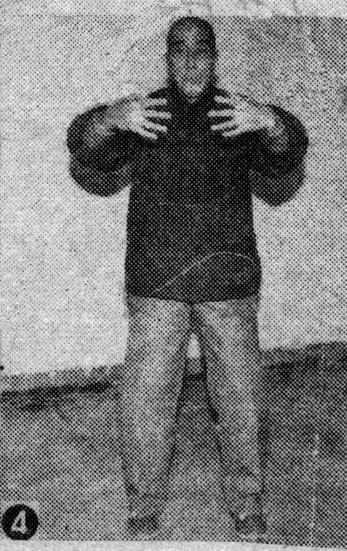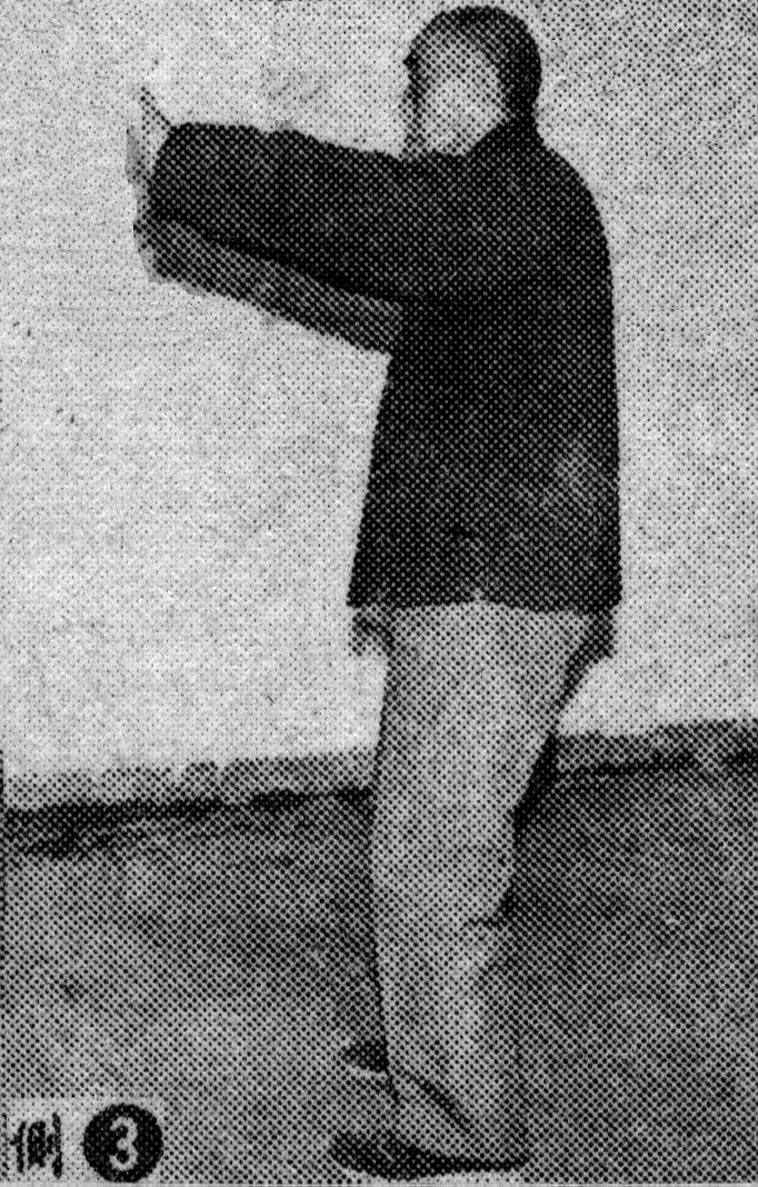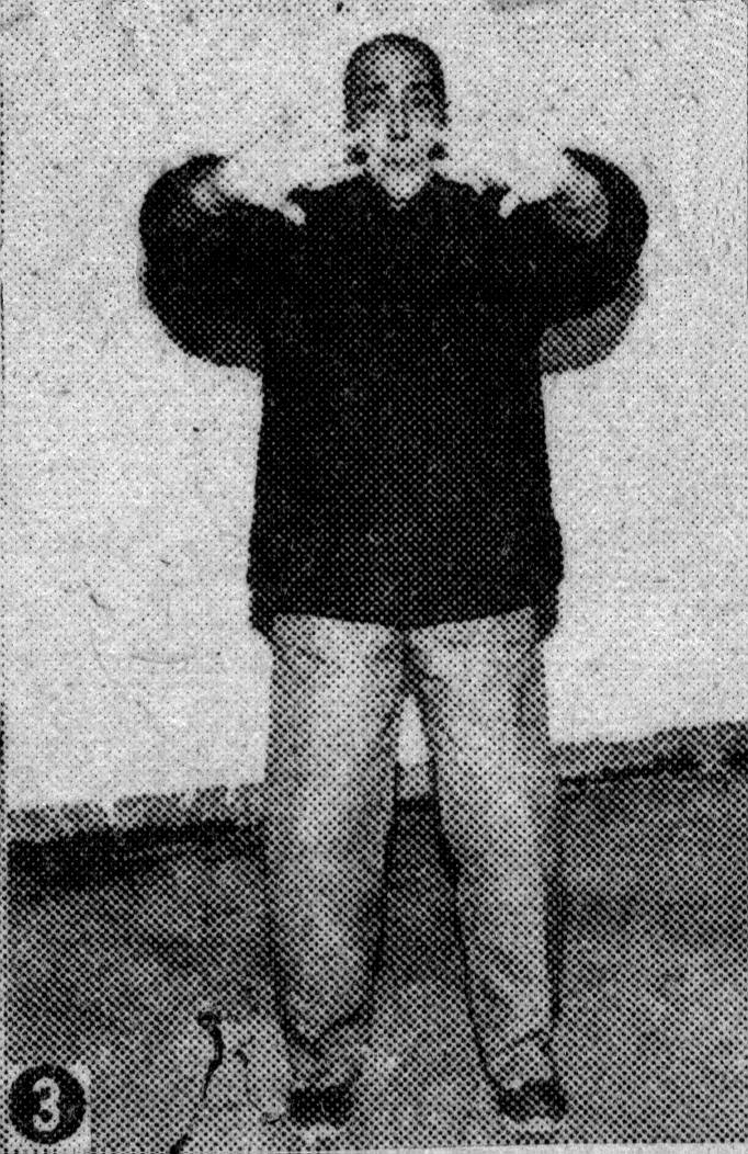 The beginning form is like the previous one. Both arms drill up in front of the chest. The drilling stops when the middle finger tip is even with the eyebrows. The palms face your face. Their distance from the face is 5 to 6 inches. Sink the shoulders, drop the elbows. Open the back. Concave the chest. The head pushes up. The neck is erect. The eyes look towards the front. (27)