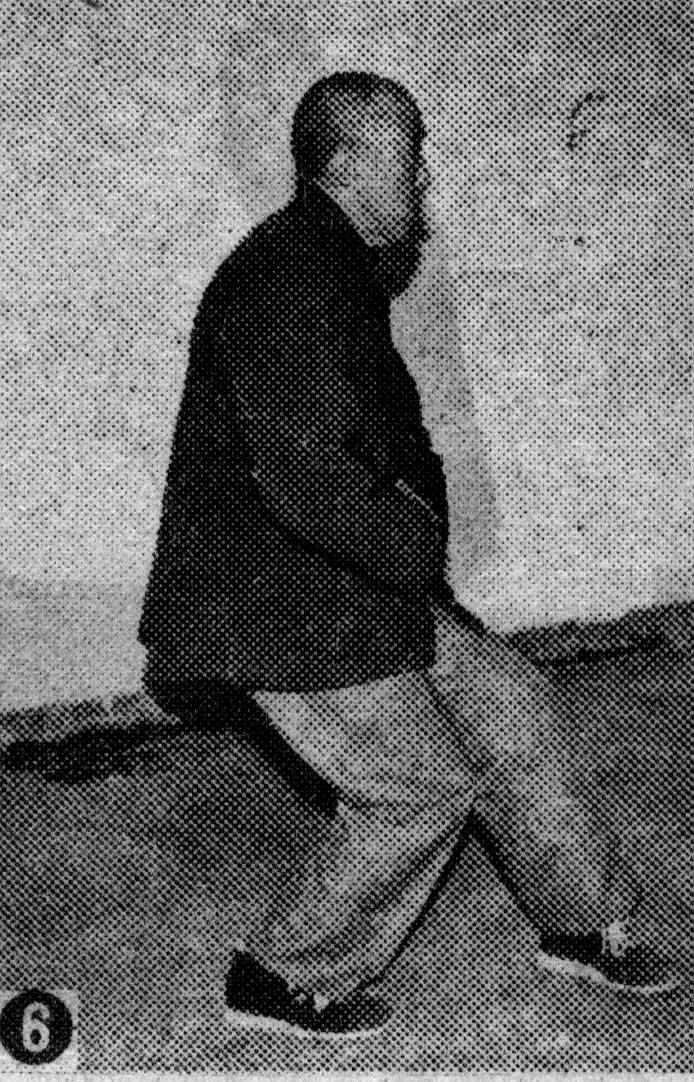 The upper body shape does not change. Walk the circle towards the left. The stepping method and breathing are like the first form. Walk many circles without limit. The falling step makes the exhale. The qi sinks down and the shoulders sink down. The back pushes toward the front. The forearms, wrists, palms, and fingers are like they are relaxed, yet contracted. They have stretched energy but are not stiff. One step, one change of the energy, changing endlessly.