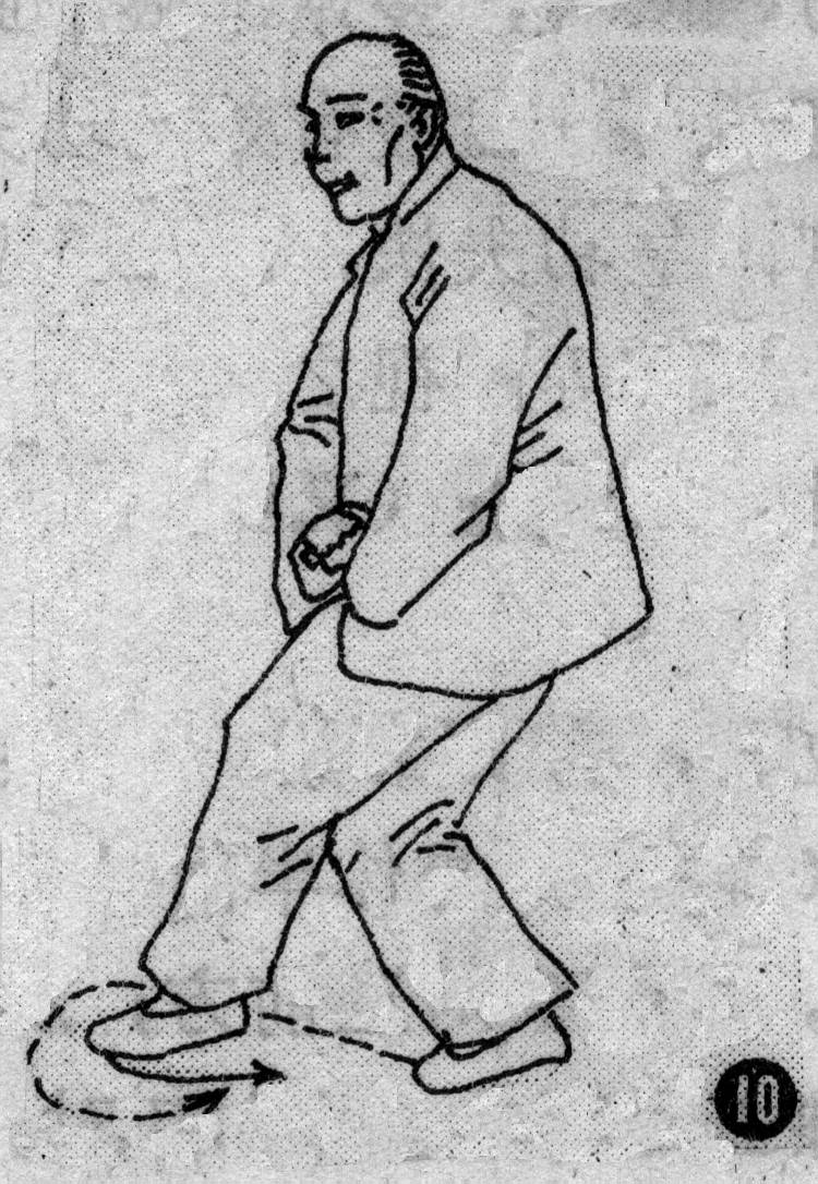 After the form is finished, first walk around the circle toward the left. Walk many circles without limit. Then change directions and walk toward the right. Walk many circles without limit. The stepping method, breathing, and turning methods are like in Form 1.