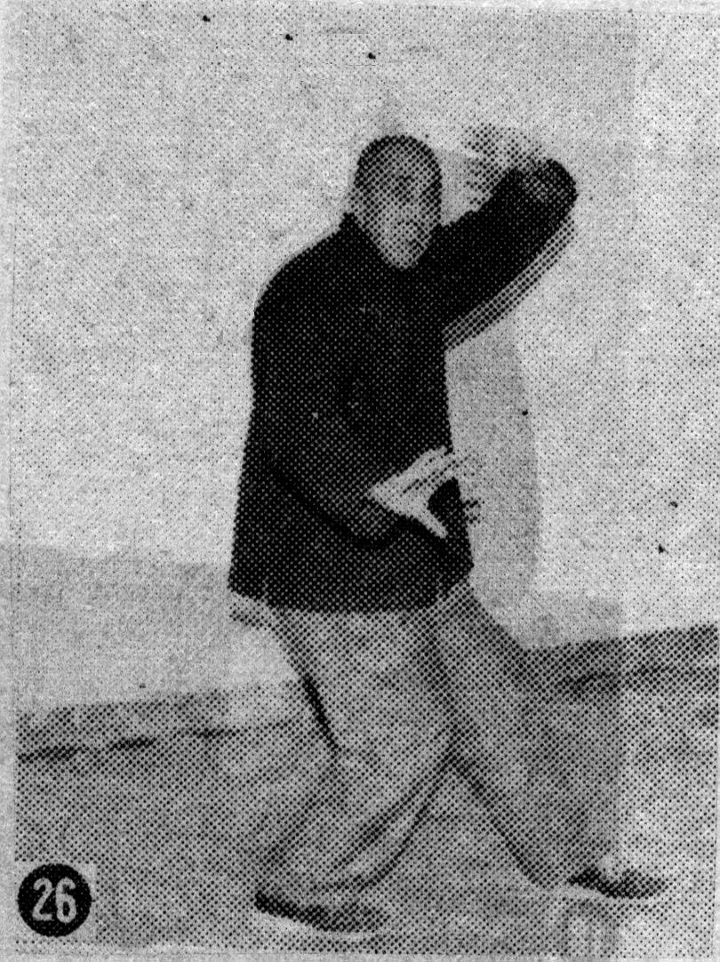 When changing directions, toe-in the right foot and raise the left foot. Rub the shins like the previous form. The upper arm actions are like picture 28, only reversed.